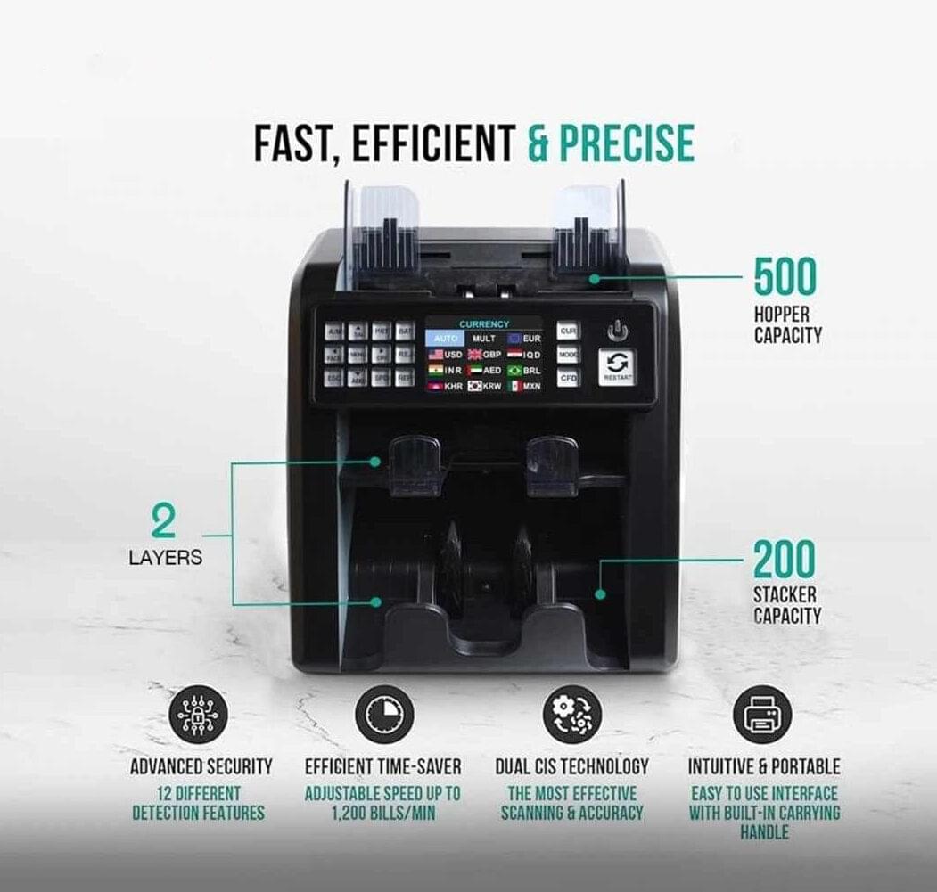 تعتبر افضل ماكينة عد نقود حيث يمكن للماكينة عد 500 ورقة نقدية في المرة الواحدة، مع إمكانية إضافة النقود أثناء العد.